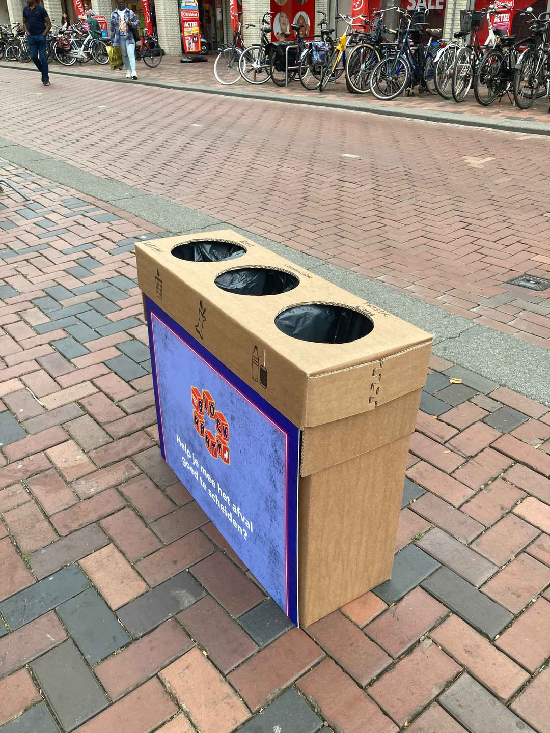 Voor the Groundbreakers hebben we onze bestaande trio prullenbak voorzien van een mooie print op de voorzijde op displaykarton. Dank voor de opdracht Douwe!