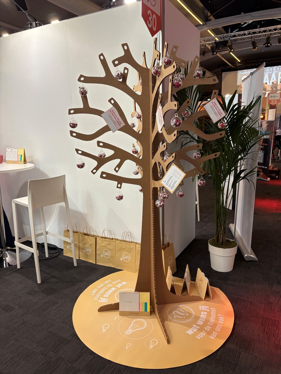 De grote kartonnen boom met takken van 200 cm hoog is een echte eye-catcher op elk evenement. De boom is gedetailleerd, kan bruin, wit of met je eigen design geleverd worden en wordt gemaakt van honingraat karton. De boom heeft de afmetingen 115 x 115 x 200 cm.
