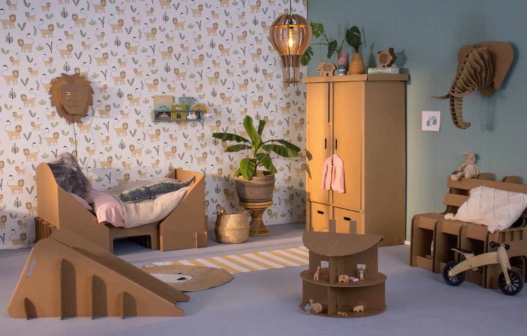 De kinderkamer is de plek waar jouw zoon of dochter helemaal zichzelf kan zijn en kan ontspannen. In ons kinderassortiment bieden wij diverse kindermeubels om de kinderkamers op een duurzame manier in te richten en aan te kleden. De basis van een kinderkamer is natuurlijk het bed, ons kartonnen peuterbed is verkrijgbaar in vijf verschillende maten en je kunt deze zelfs personaliseren door de naam van je kind uit te laten snijden in het karton. Is jouw zoon of dochter te groot geworden voor een peuterbedje? Dan kun je deze eenvoudig recyclen en vervangen door een groot bed van karton. Een kinderkamer is natuurlijk niet compleet zonder mooie verlichting. Voor kinderen bieden wij diverse lampen in de vorm van een dier zoals onze Leeuw wandlamp of de vrolijke Koos de Koala lamp!