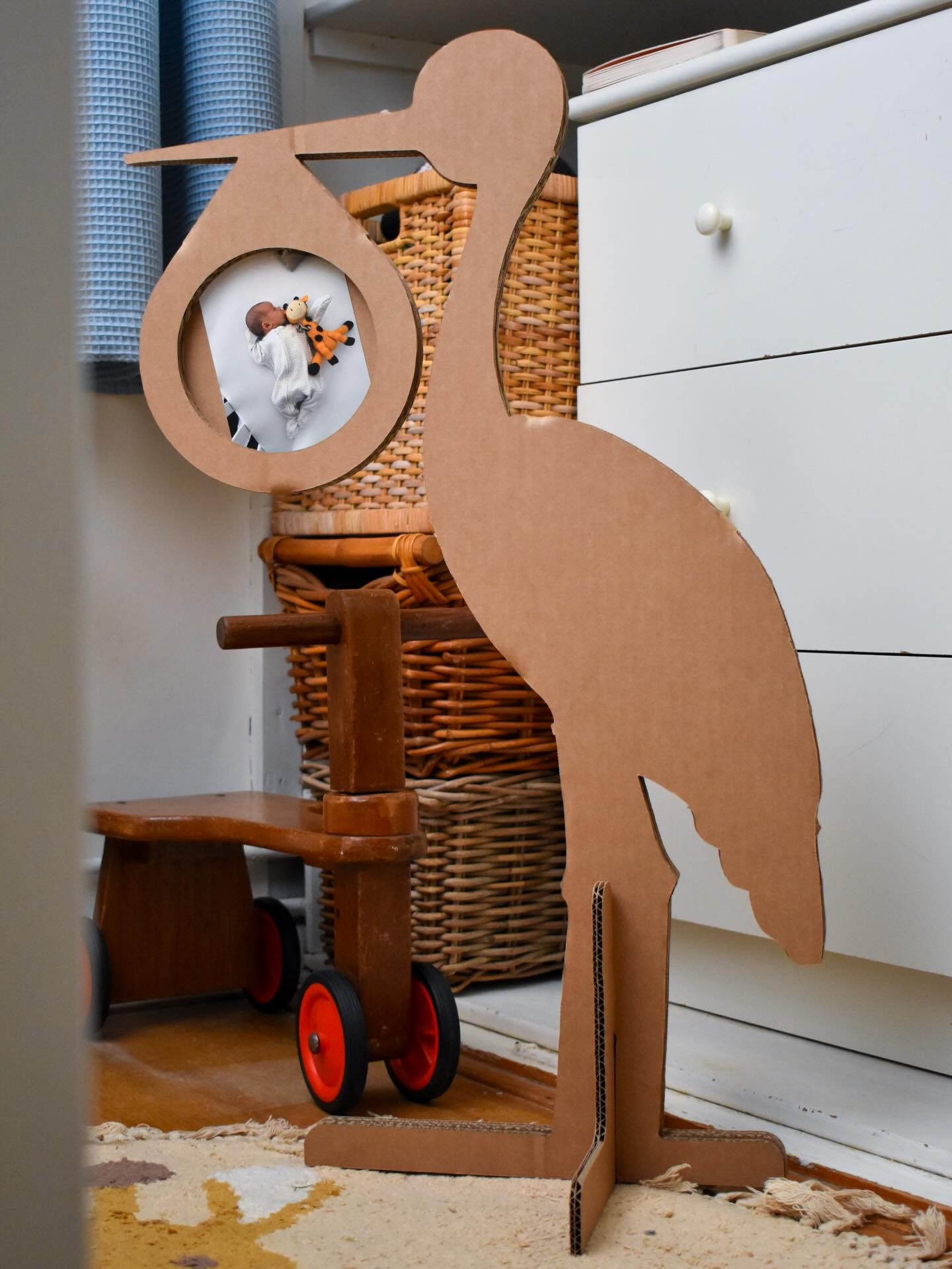 Kartonnen ooievaar als geboorte decoratie