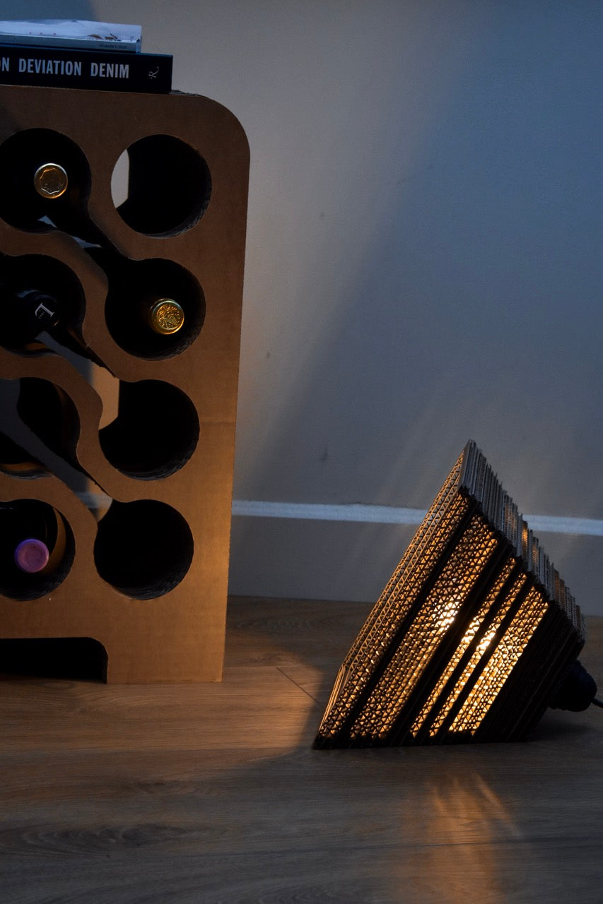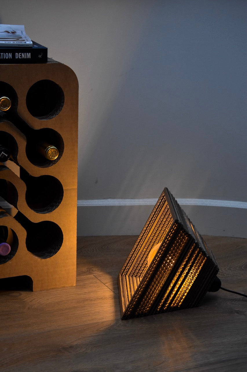 Deze kartonnen lamp, de Stavern, is een sfeervolle aanwinst voor je huis, want de golfstructuur van ons karton zorgt ervoor dat het licht er mooi doorheen schijnt. De lamp kan opgehangen worden, maar de geometrische piramidevorm geeft ook de mogelijkheid om de lamp neer te leggen op een tafeltje.