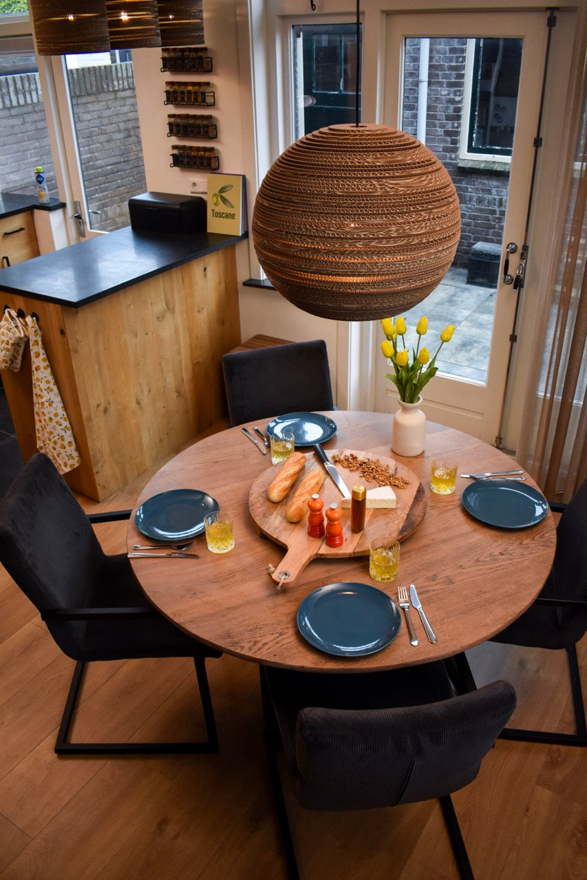 Deze handgemaakte lamp staat stijlvol in huis! Onze Caen kartonnen lamp bestaat uit ringen golfkarton die zorgvuldig op elkaar worden gelijmd. De lamp geeft sfeervol licht door zowel de golven van het karton en aan de onderkant.