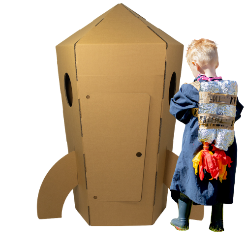 Deze raket is gemaakt van karton en is nu klaar voor een nieuw avontuur bij jou thuis.