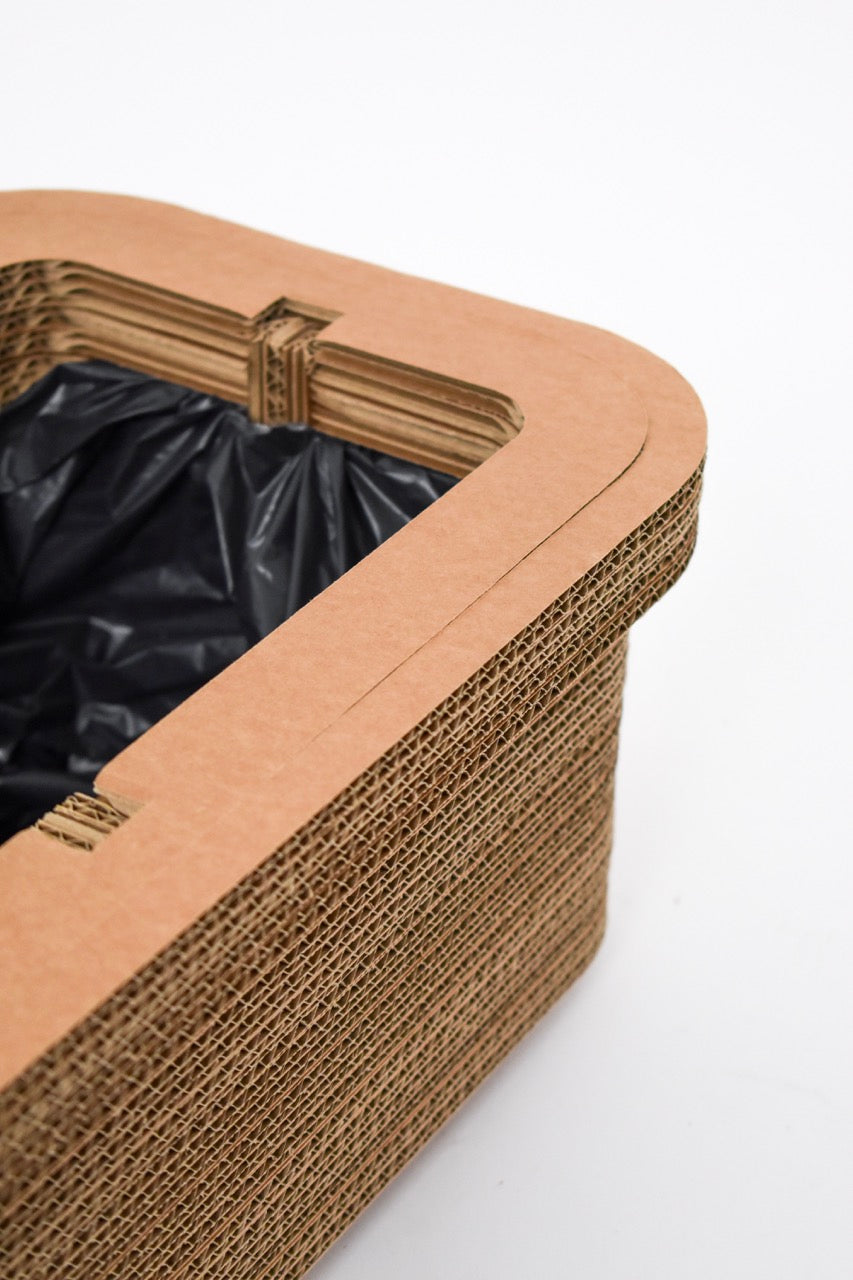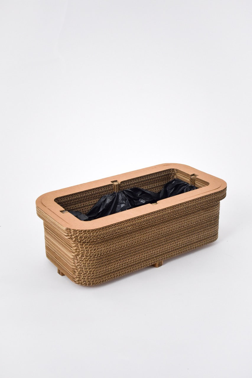 De plantenbak bestaat uit meerdere kartonnen lagen die samen een solide geheel vormen. Leg er een vuilniszak in, vul ‘m met aarde en plant je favoriete plantjes erin. bloemen, alles kan.