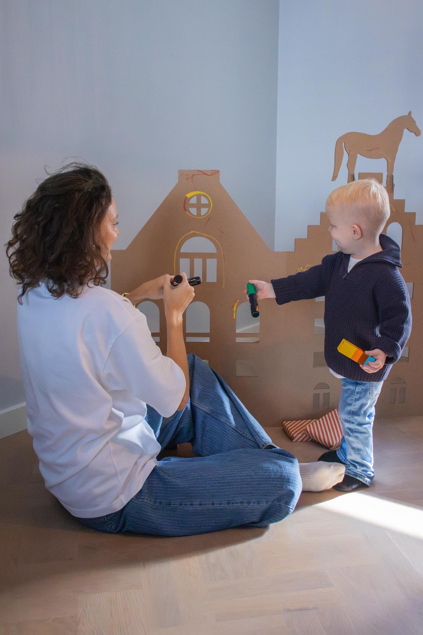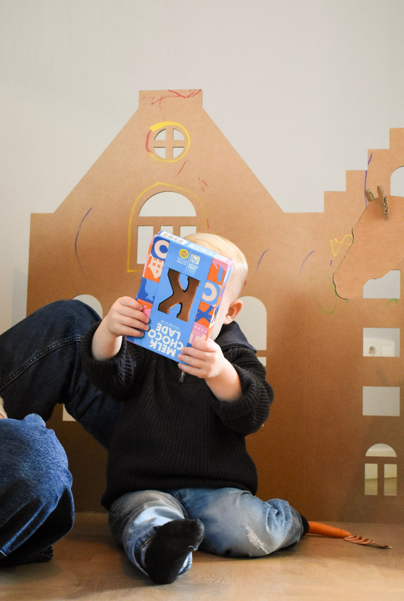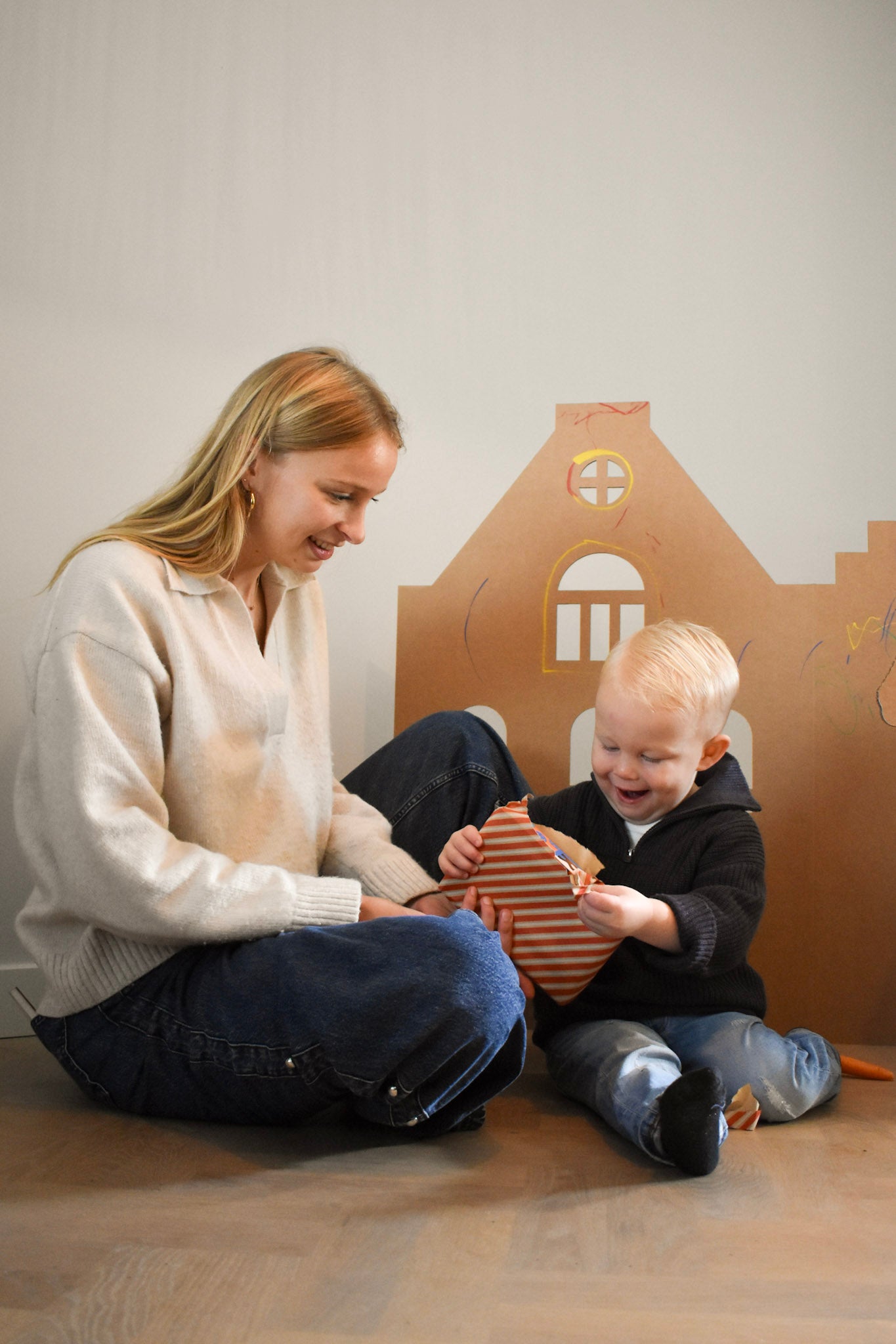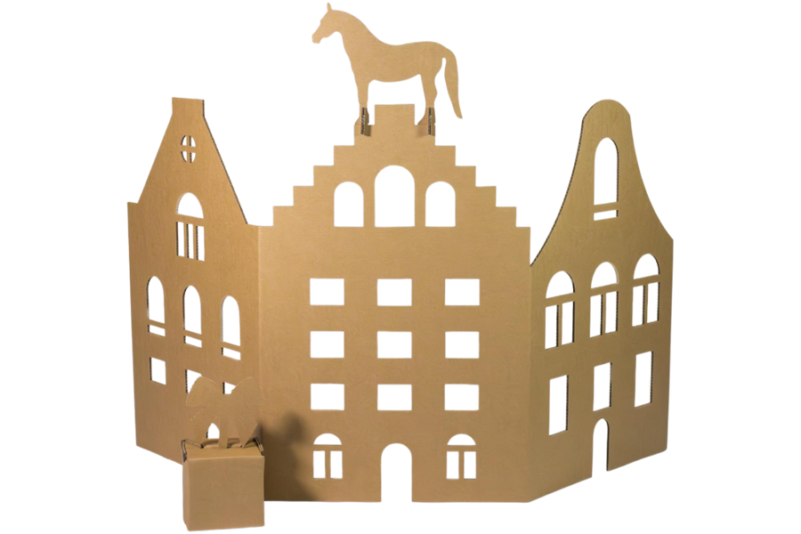 Zet je schoen maar klaar, want deze kartonnen grachtenpandjes brengen direct de Sinterklaassfeer in huis! De speelwand bestaat uit drie grachtenhuizen met raampjes waar je kind achter kan kruipen, spieken of doorheen kan zwaaien. Op het dak? Daar hoort natuurlijk het paard van Sinterklaas! En om het feest compleet te maken: een kartonnen cadeautje mét strik.