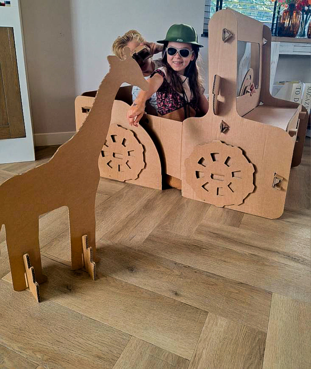 Ich gehe auf Safari und was nehme ich mit? Natürlich einen Jeep aus Pappe! Der Jeep ist voll ausgestattet mit einem Ersatzrad, einem Fernglas, einem Vogel und natürlich einem weiteren wilden Tier: einer Giraffe. Perfekt für Kindergeburtstage, Thementage, Spielplätze oder einfach so. Der Jeep ist groß genug, um hineinzukriechen, auf Entdeckungsreise zu gehen oder sich ein spannendes Abenteuer auszudenken.