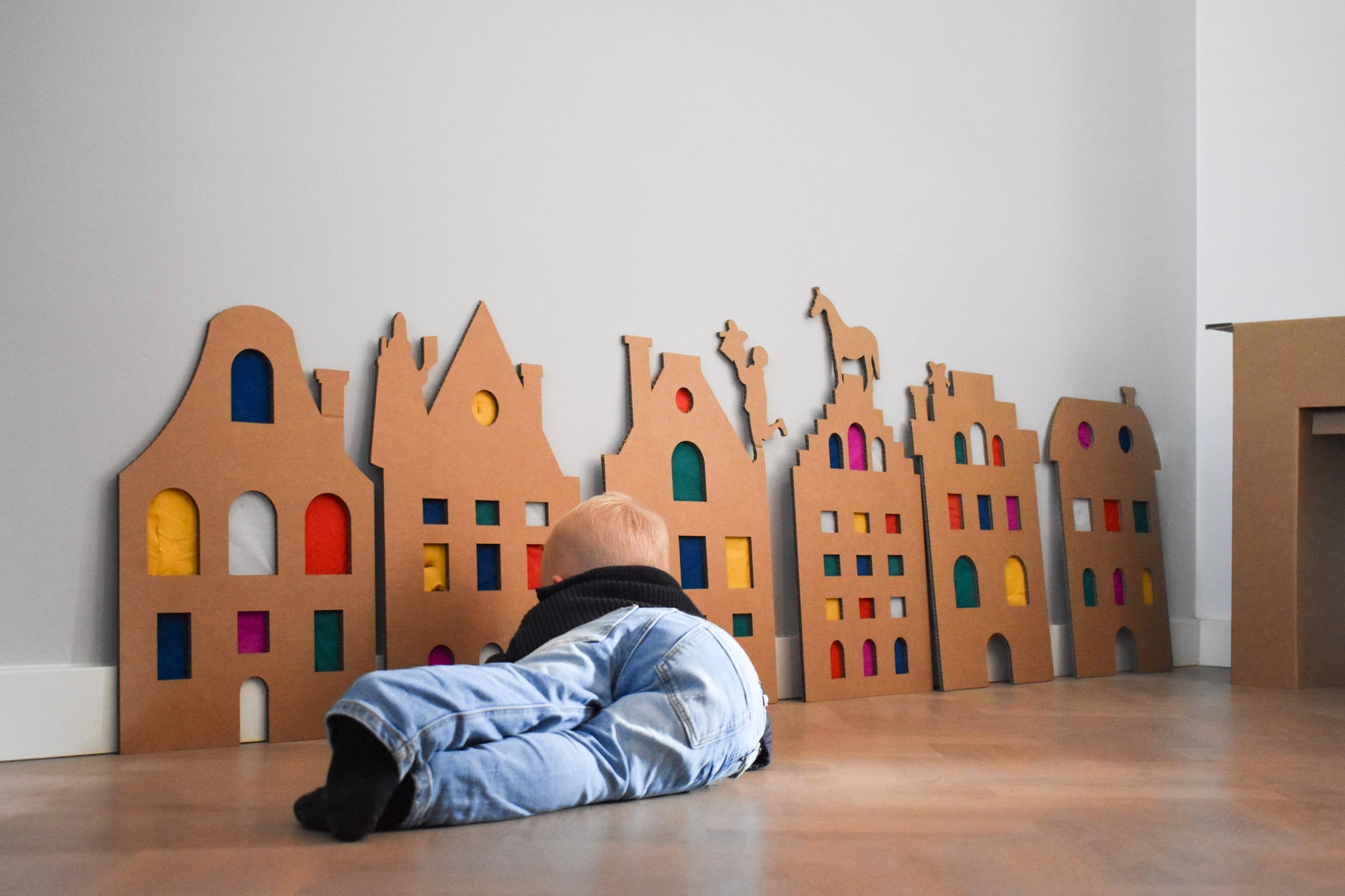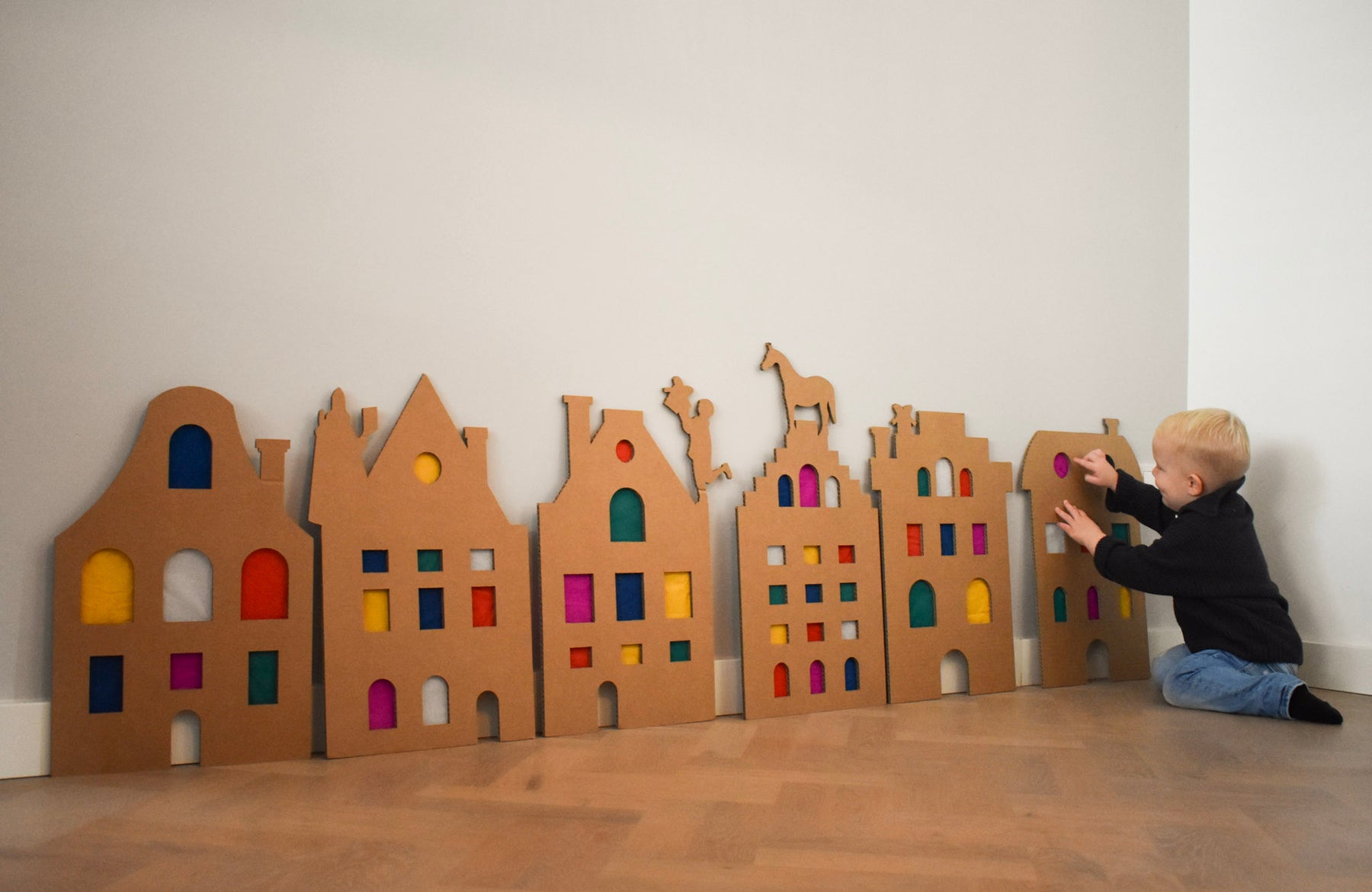 En het allerleukste? Je kunt alles zelf versieren! Kleur de huisjes in, kleur ze in en vul de raampjes met gekleurd crêpepapier. Als het licht erdoor schijnt, krijg je een hele mooie kleuren.