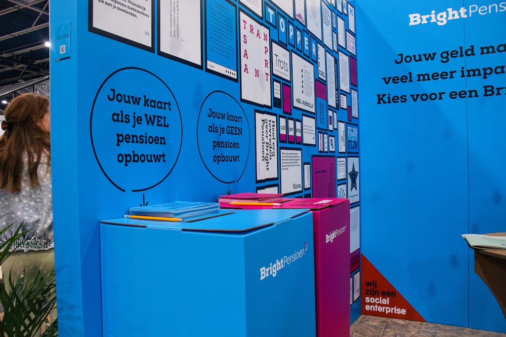 At the Impact Fair 2025, BrightPensioen shone with a striking booth. BrightPensioen is B Corp certified, so an environmentally conscious booth was a must. That's why they chose a booth made entirely of cardboard! With its vibrant colors, this booth was a hit.