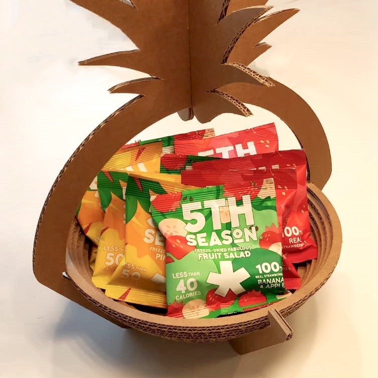 For 5th-Season, we developed a fruit basket for their dried fruit bags. The idea is that the baskets can be shipped flat to customers who can assemble and fill them themselves for their employees. We tried and created several shapes to make the basket resemble a pineapple as closely as possible.