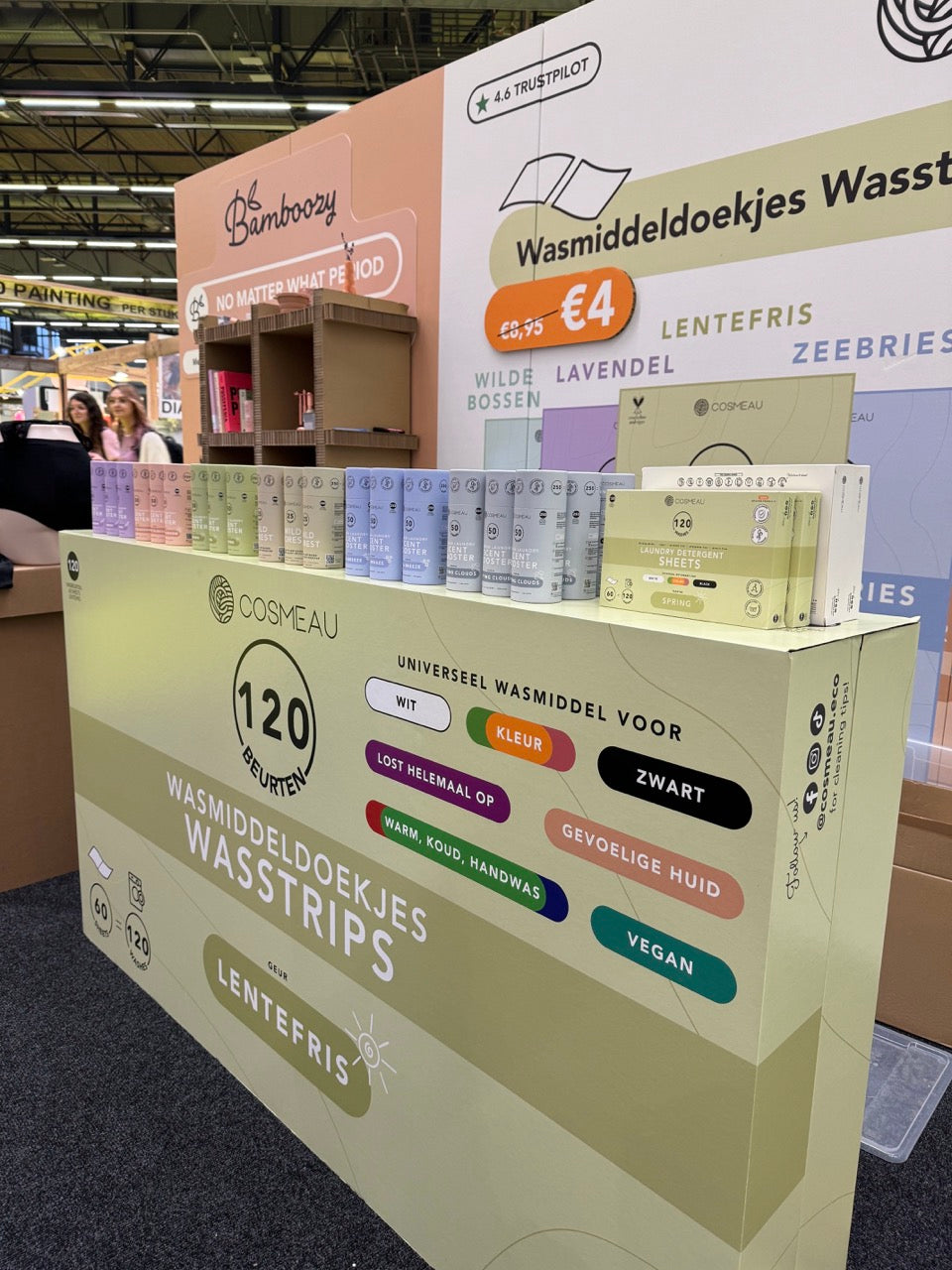 For the Huishoudbeurs we designed a very nice buersstand on behalf of Cosmeau with a washing machine and a cool distribution counter with storage compartments at the back. Their soap in large and a round display also completed the whole.