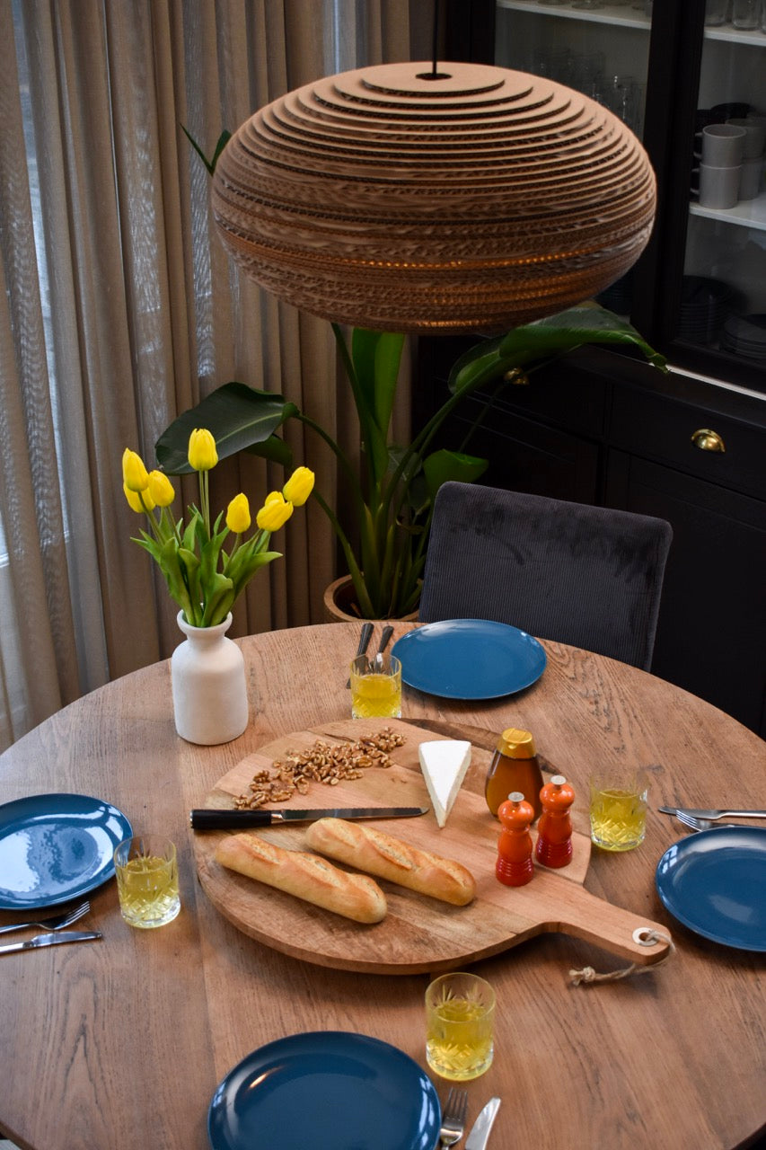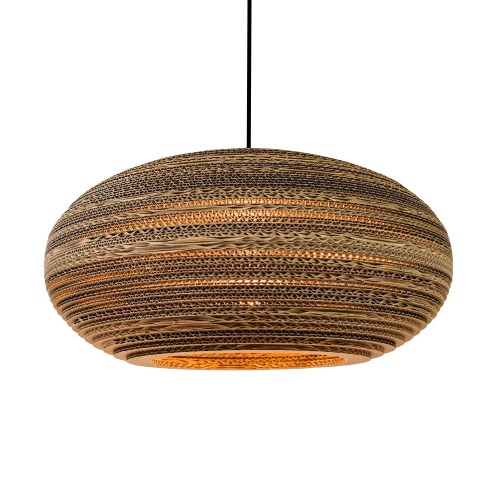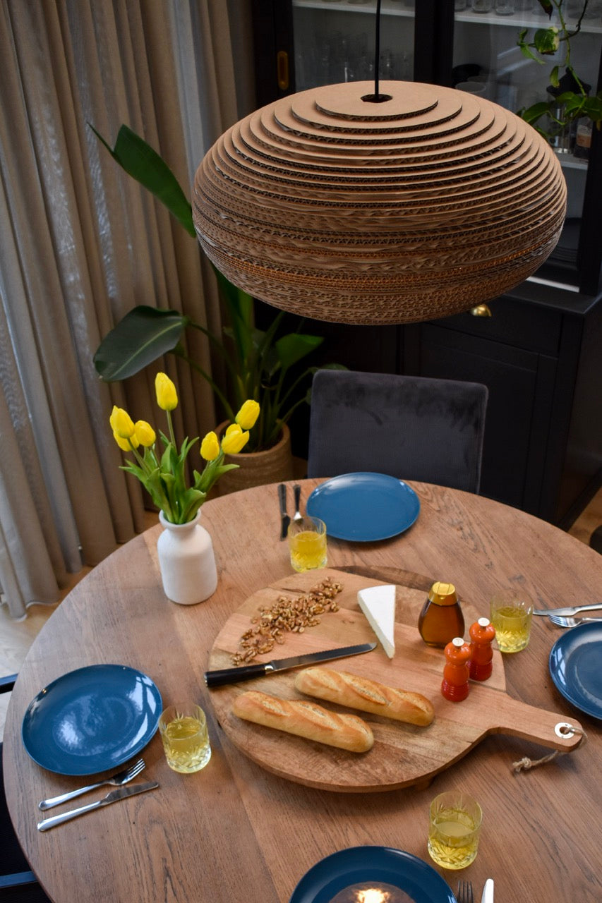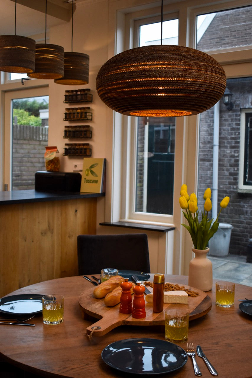 Stylish and sustainable lamp made of cardboard. The Dour pendant lamp is made with precision for you. The cardboard lamp has a diameter of 50 cm and the corrugations of the cardboard allow the light to shine beautifully through the openings. The cardboard immediately gives your space a sustainable and warm atmosphere.