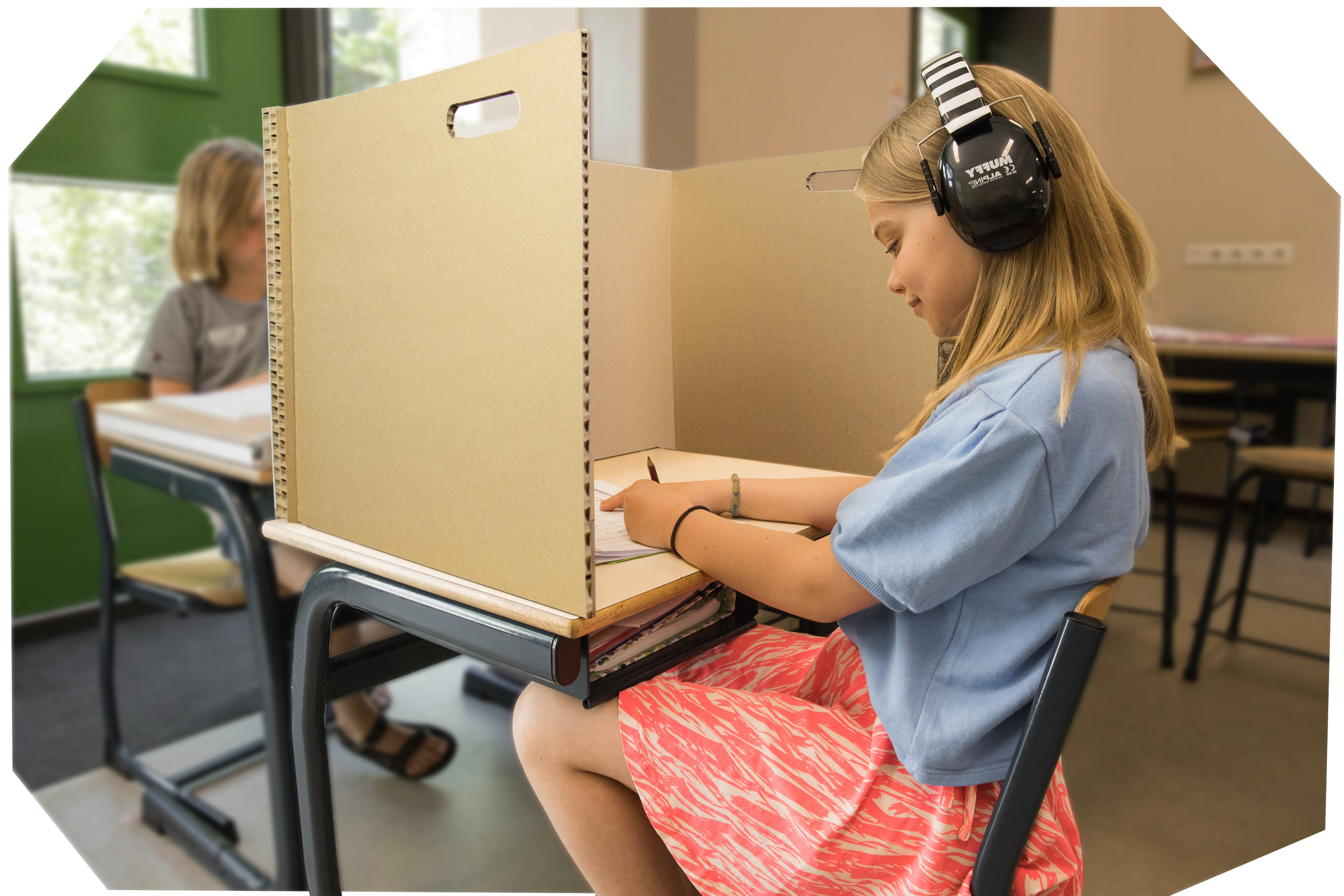 Practical cardboard products such as our Study Buddy and the Study Buddy Cabinet are ideal for helping children organise their school supplies. The Study Buddy provides a place where children can keep their supplies organised, while the cabinet functions as a central storage space. Our cardboard concentration screen is also a solution for students who need extra focus. Made from sturdy cardboard, the screen ensures a calm learning environment and contributes to better performance in the classroom.