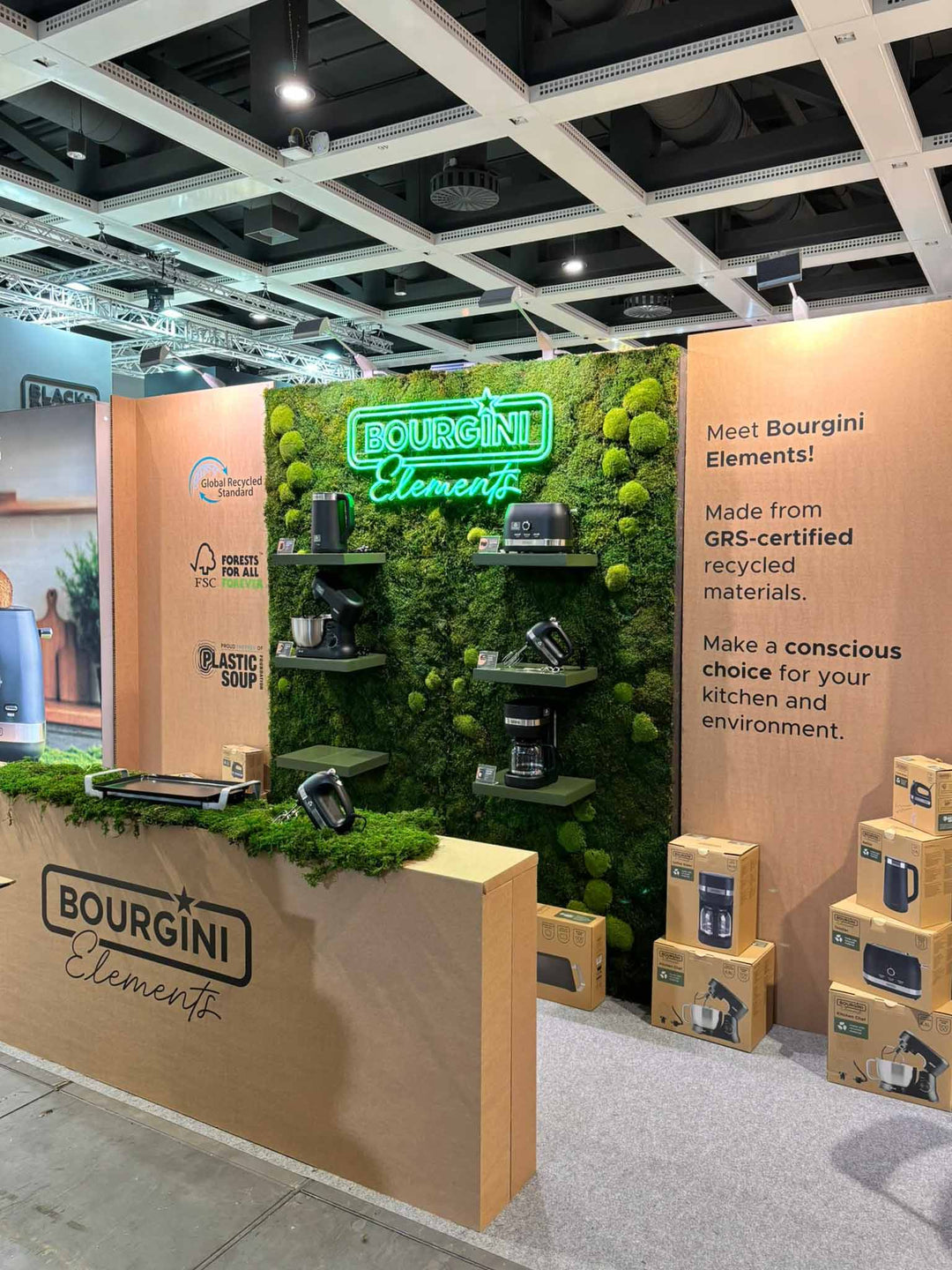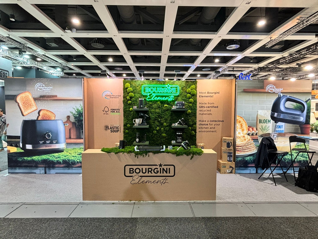 Ook op de beursvloer wilde Bourgini Elements dit duurzame verhaal overbrengen. Voor hen hebben wij een kartonnen balie en achterwand gecreëerd. Het karton was goed zichtbaar met een subtiele bedrukking. Wij vinden het er waanzinnig uit zien!