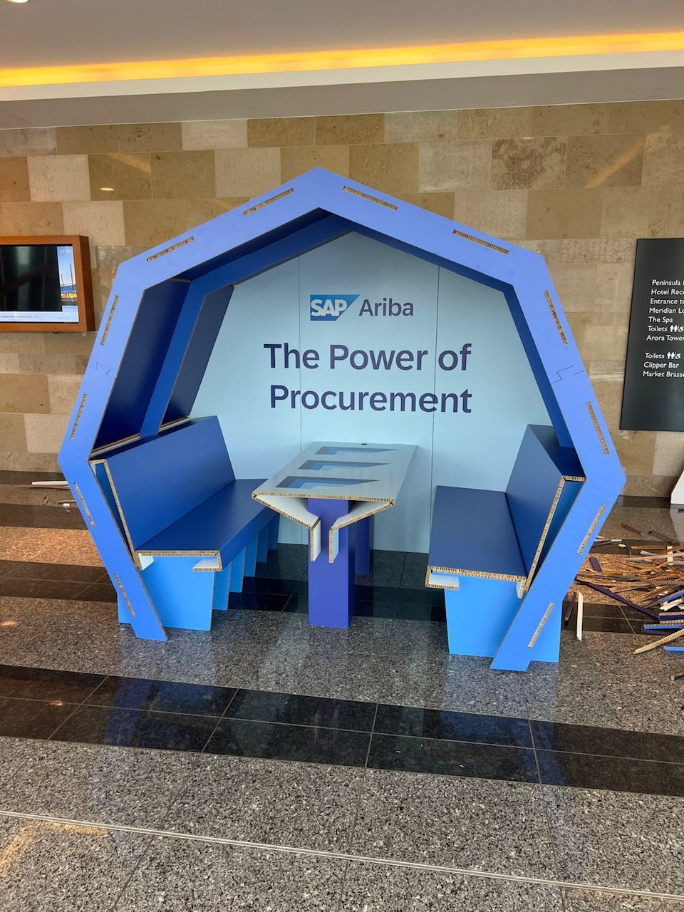 Voor een evenement van Amazon Business en SAP Ariba zijn wij naar Engeland gegaan! In de O2 Arena hebben wij twee mobiele vergaderruimtes van karton opgebouwd waar ruim vier personen in passen. Het karton is stevig genoeg om dit gewicht met gemak te kunnen dragen.