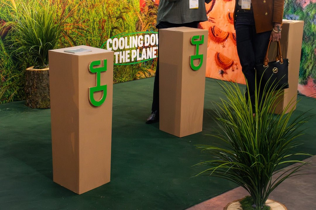 Bij deze missie hoort ook een milieubewuste aankleding van de beursstand! Hierom koos Justdiggit voor kartonnen sokkels met hun logo. Dit logo is uit honingraat karton gesneden en daarna bevestigd aan de sokkel.
